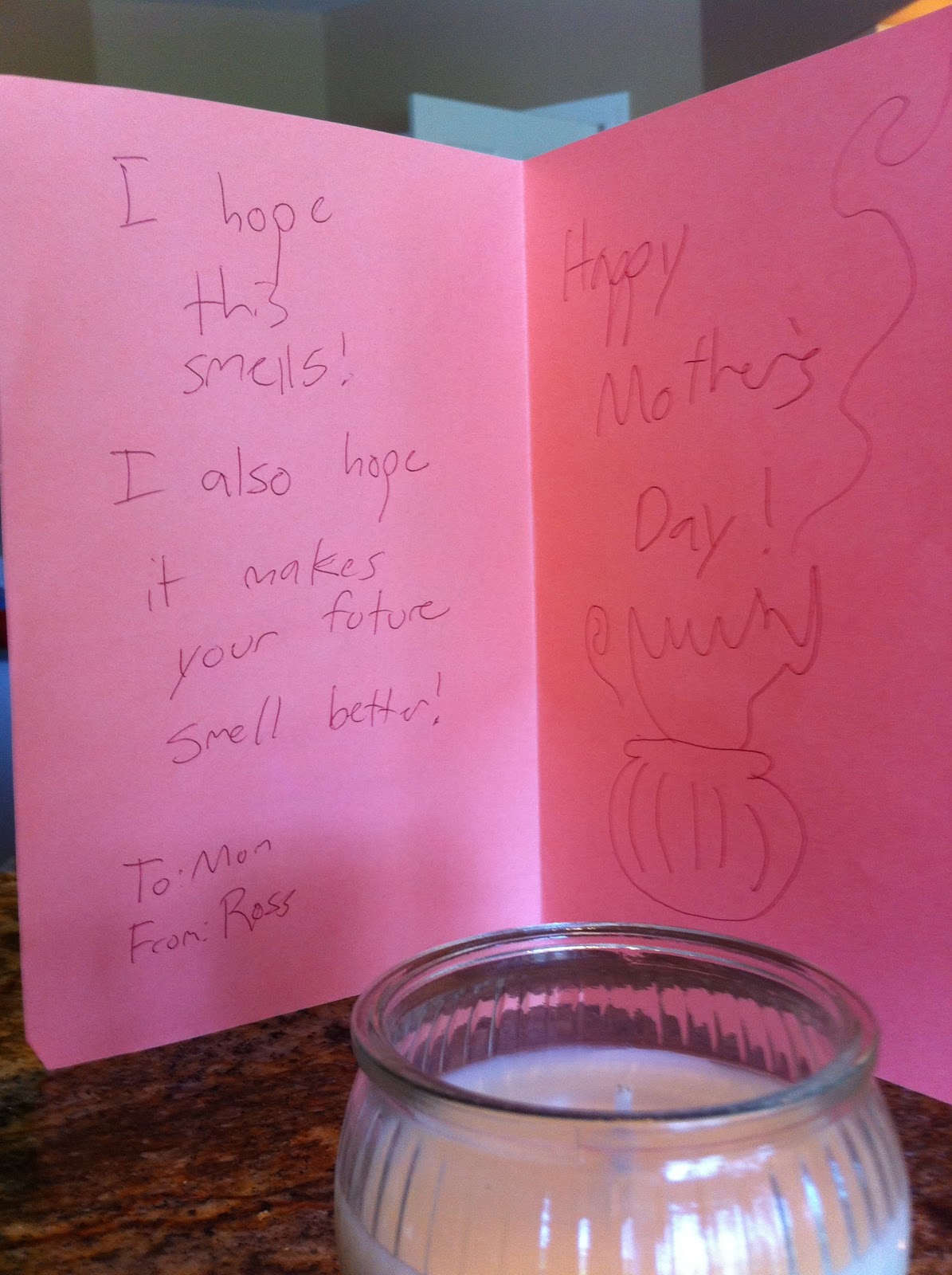 Here, Mom, he says, and hands me the chopstick/card (sans plant). This is for you. Happy Mother's Day!